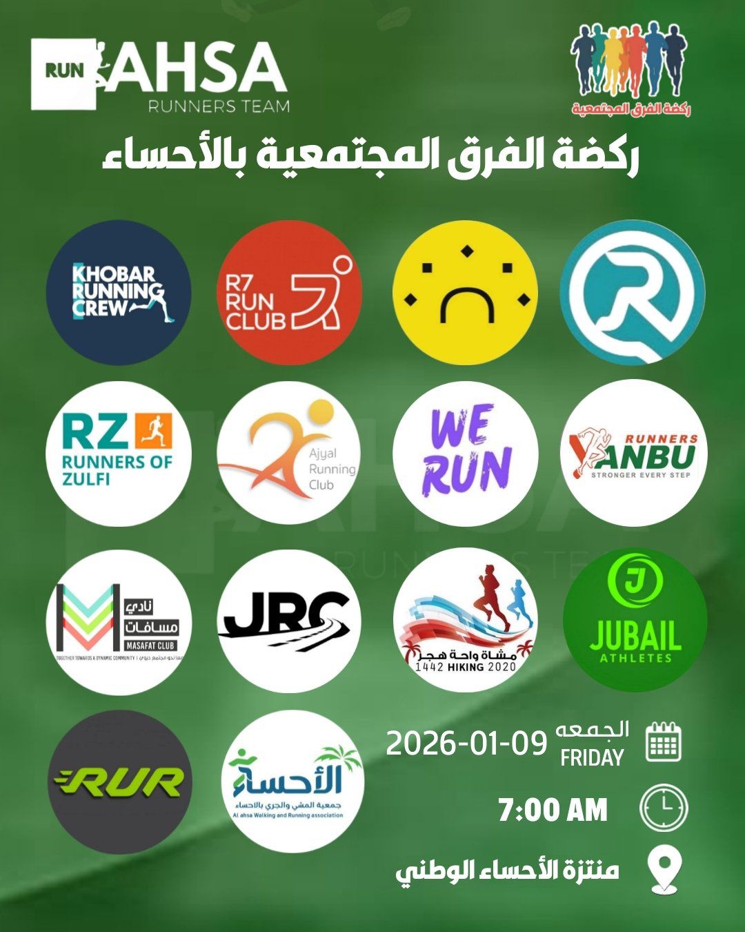 تُقام يوم الجمعة 9 يناير 2026م في تمام الساعة السابعة صباحاً ، ركضة الفرق المجتمعية بالأحساء 2026م، قبل يوم واحد من انطلاق سباق الحسا تركض، ضمن برامج تعزيز الرياضة المجتمعية ونشر ثقافة الجري والمشاركة المجتمعية.