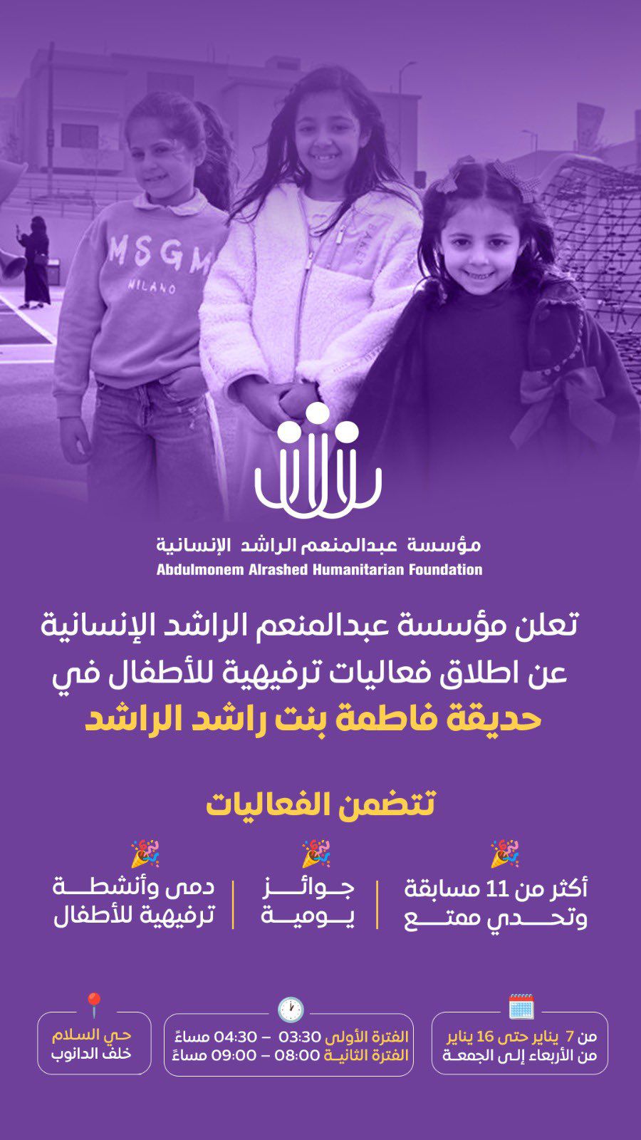 أعلنت مؤسسة عبدالمنعم الراشد الإنسانية عن إطلاق فعاليات ترفيهية مخصّصة للأطفال في حديقة ( فاطمة بنت راشد الراشد بالمبرز ) ، تشمل أكثر من 11 مسابقة وتحديًا ممتعًا، وجوائز يومية، وأنشطة ترفيهية متنوعة.