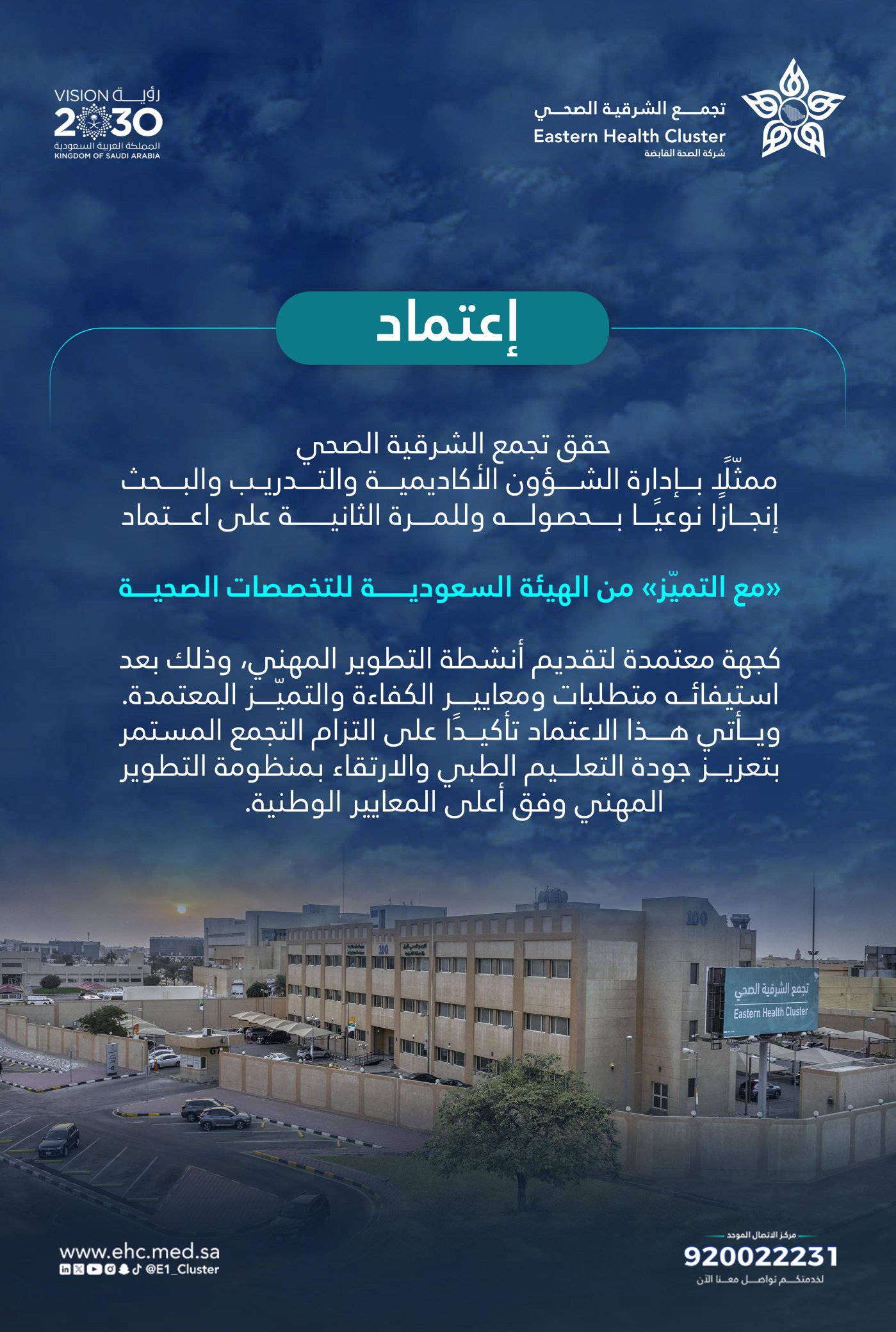 حقق تجمع الشرقية الصحي ممثلا بإدارة الشؤون الأكاديمية والتدريب والبحث إنجازا نوعيًا بحصوله وللمرة الثانية على اعتماد “مع التميز” من الهيئة السعودية للتخصصات الصحية كجهة معتمدة لتقديم أنشطة التطوير المهني، وذلك بعد استيفائه متطلبات ومعايير الكفاءة والتميز المعتمدة.