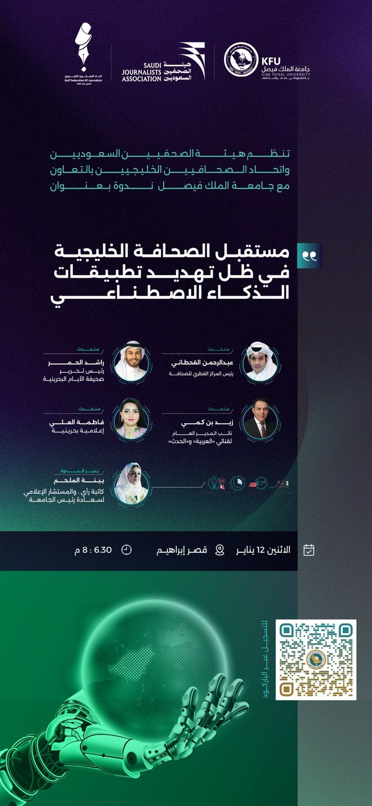 تستضيف جامعة الملك فيصل، بالتعاون مع هيئة الصحفيين السعوديين واتحاد الصحفيين الخليجيين، ندوةً متخصصة بعنوان (مستقبل الصحافة الخليجية في ظل تهديد تطبيقات الذكاء الاصطناعي) وذلك ضمن جهودها في مناقشة التحولات المتسارعة في المشهد الإعلامي وتعزيز الوعي بالتحديات والفرص التي تفرضها التقنيات الحديثة.