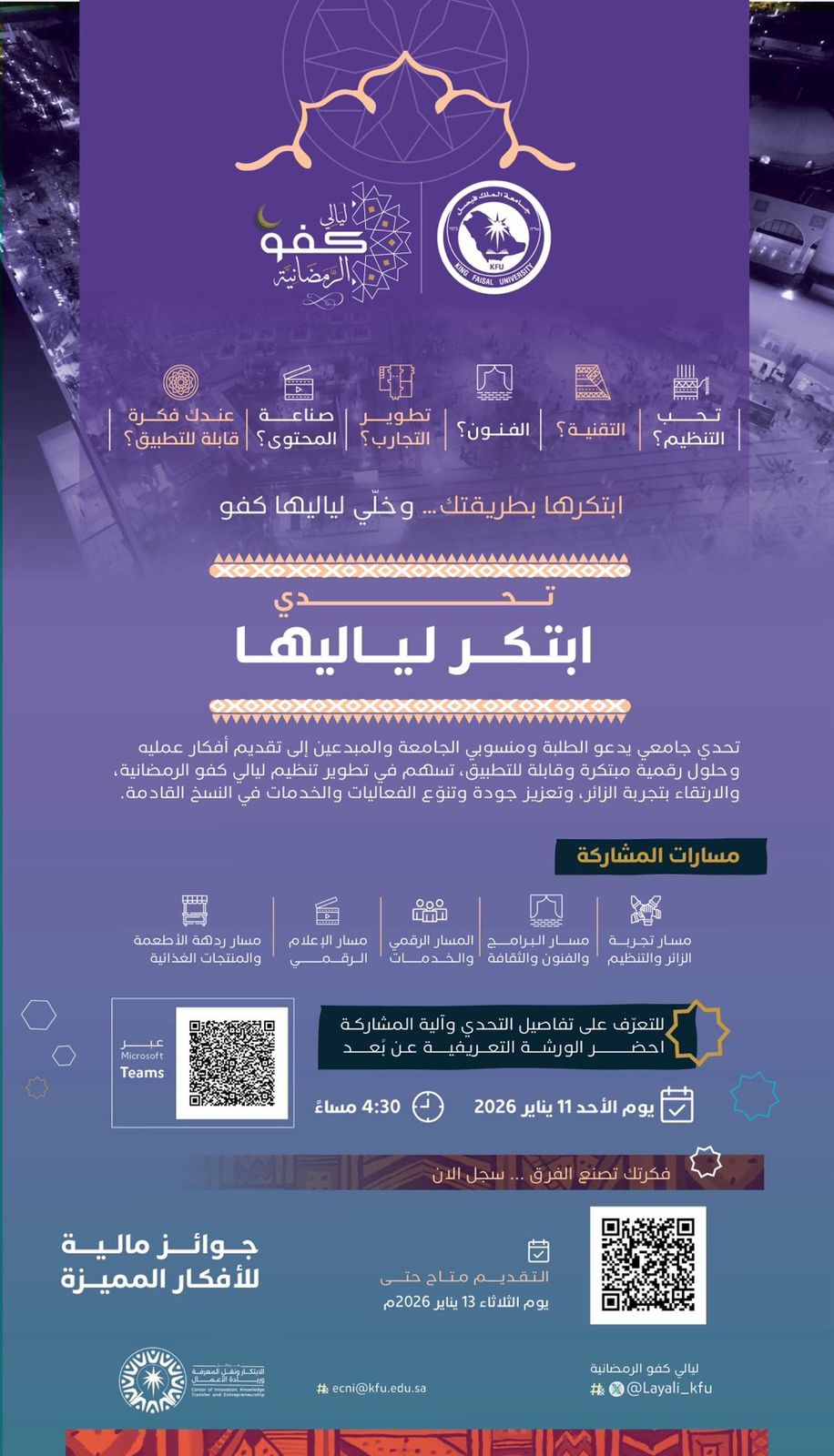 أطلقت جامعة الملك فيصل تحدي “ابتكر لياليها” ، الهادف إلى تطوير ليالي كفو الرمضانية عبر استقطاب أفكار مبتكرة وحلول رقمية عملية تسهم في الارتقاء بتجربة الزائر وتحسين جودة التنظيم والفعاليات في النسخ القادمة.