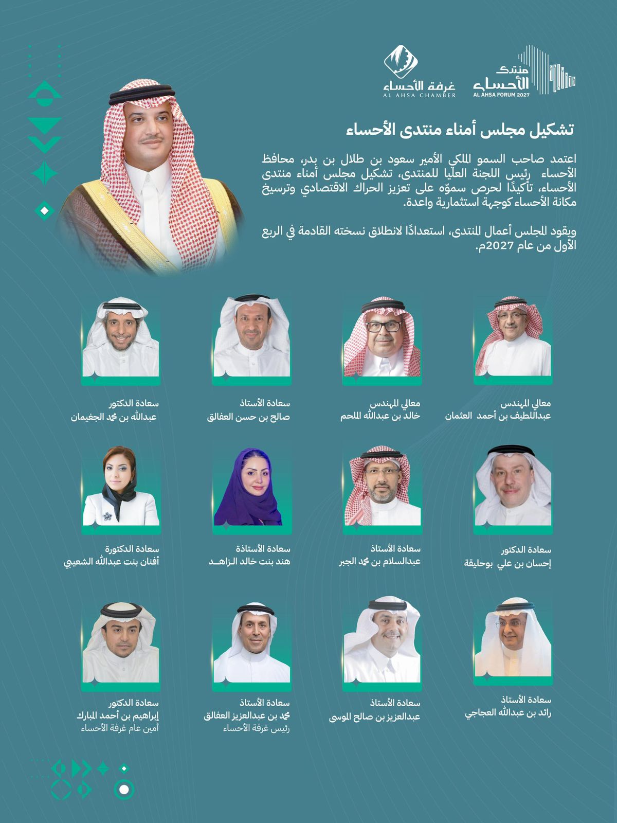اعتمد صاحب السمو الملكي الأمير سعود بن طلال بن بدر، محافظ الأحساء ورئيس اللجنة العليا لـ منتدى الأحساء، تشكيل مجلس أمناء منتدى الأحساء، تأكيدًا لحرص سموه على تعزيز الحراك الاقتصادي وترسيخ مكانة الأحساء كوجهة استثمارية واعدة.
