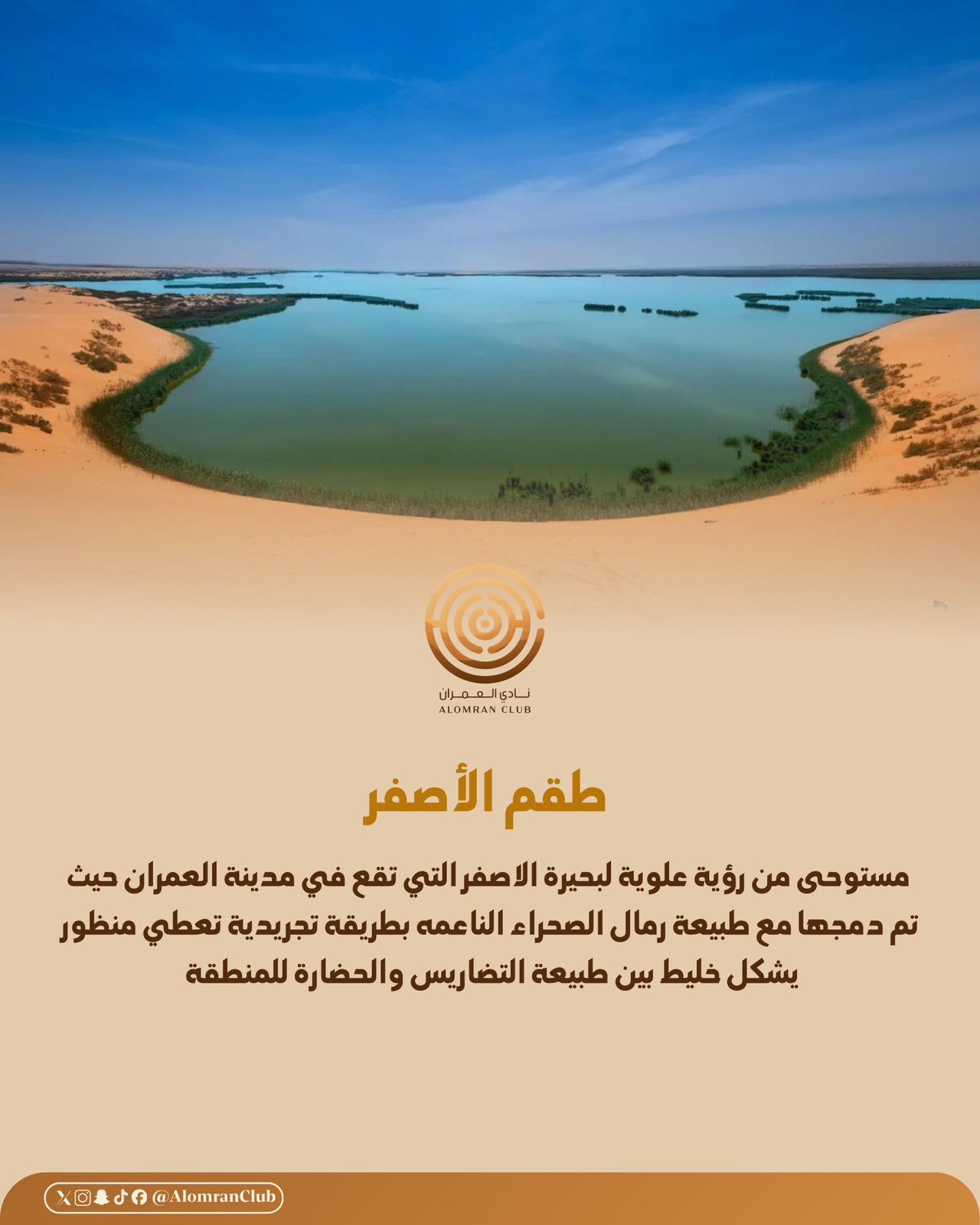 وجاء التصميم بدمجٍ تجريدي بين ملامح البحيرة وطبيعة رمال الصحراء الناعمة، ليمنح منظورًا بصريًا يعكس خليطًا متوازنًا بين تضاريس المنطقة وحضارتها، ويترجم علاقة أهالي العمران ببحيرة الأصفر كوجهة شتوية مميزة ومرتبطة بذاكرة المجتمع.