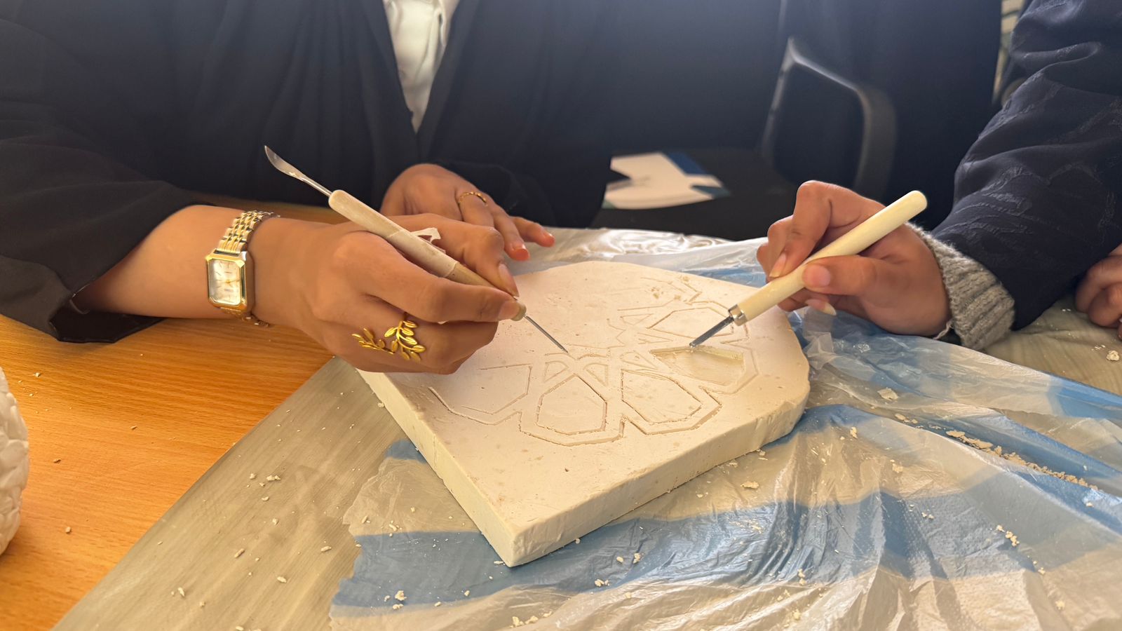 وشارك المعهد من خلال تنظيم ورشة تدريبية متخصصة في فن الجبس لطالبات الكلية التقنية، بإشراف الحرفية وداد الأصمخ، حيث أتاحت الورشة للطالبات فرصة التعرف على أساسيات هذا الفن الحرفي، وتطبيقه عمليًا بأسلوب إبداعي حديث يواكب متطلبات سوق العمل وريادة الأعمال.
