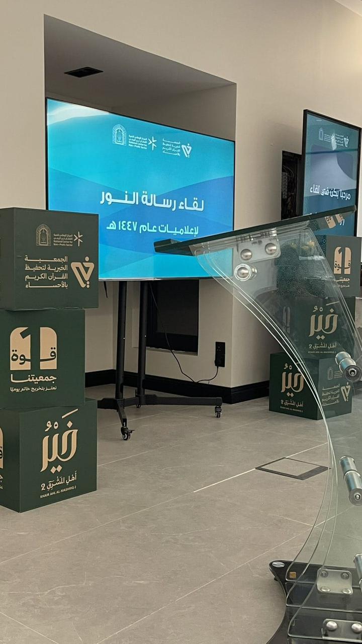 نفّذت الإدارة النسائية بـالجمعية الخيرية لتحفيظ القرآن الكريم بالأحساء لقاءً إعلاميًا بعنوان «رسالة النور»، مساء يوم الثلاثاء 07/09/1447هـ، بحضور أكثر من (25) إعلامية، وذلك في إطار تعزيز الشراكة الإعلامية وإبراز منجزات الإدارة التطويرية وبرامجها النسائية.