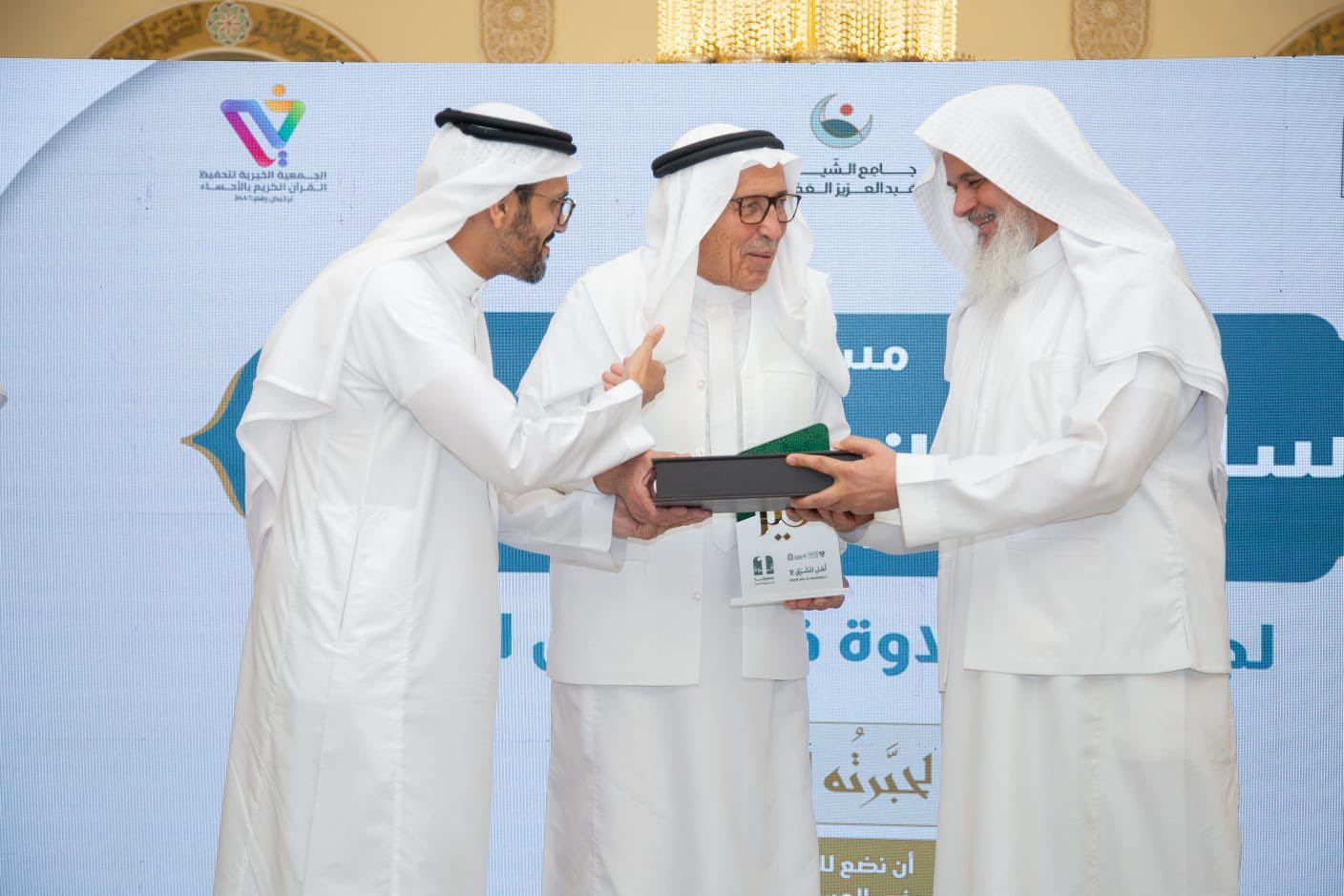 وفي ختام الحفل، جرى تتويج الطلاب الفائزين وتسليمهم الجوائز تقديرًا لتميزهم وجمال أصواتهم في تلاوة كتاب الله، كما قدّمت الجمعية تكريمًا خاصًا للشيخ عبدالعزيز بن سليمان العفالق عرفانًا برعايته الكريمة ودعمه المتواصل لمسيرة العمل القرآني في الأحساء .