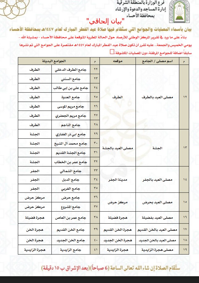 أعلنت إدارة المساجد والدعوة والإرشاد بمحافظة الأحساء، التابعة لفرع الوزارة بالمنطقة الشرقية، عن صدور “بيان إلحاقي” يتضمن تعديلات على مواقع إقامة صلاة عيد الفطر المبارك لعام 1447هـ في عدد من المراكز والهجر التابعة للمحافظة.