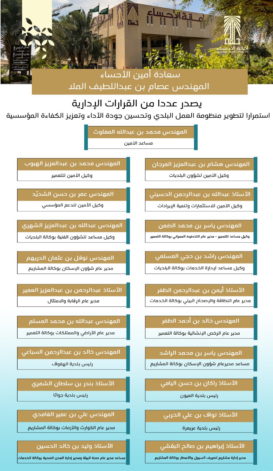 شهدت أمانة محافظة الأحساء تغييرات واسعة في قياداتها العليا، وذلك بصدور سلسلة من القرارات الإدارية من قِبل أمين الأحساء المهندس عصام بن عبد اللطيف الملا.